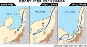 記録的な不漁となった2024年度の県内の寒ブリについて、南下する魚群が避ける大陸からの「冷水域」の張り出しが例年より強く、ブリが佐渡海峡を通過したため、主な漁獲地の佐渡島の両津湾に入らなかったとみられることが2日分かった。分析した県水産海洋研究所の担当者は「佐渡の北を通ったこれまでの不漁とは違い、過去に例がない」としている。