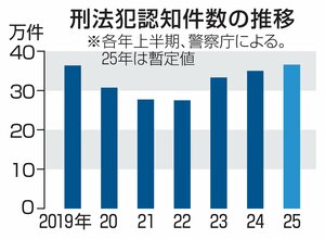 社会 2025年上半期の刑法犯認知件数36万5963件、3年連続増加し令和最悪に 新潟県は3年ぶり減少で4362件 2025/8/4 17:30 今年上半期に全国の警察が認知した刑法犯の件数は、昨年同期より1万6056件増(4・6%増)の36万5963件だったことが2日までに、警察庁のまとめ(暫定値)で分かった。上半期としては3年連続の増加... 残り720文字(全文:819文字) ここから先を読むには 続きを読む(会員登録する) 続きを読む(ログイン) 新潟日報朝刊を購読していますか? はい いいえ トップページで最新情報を見る 関連ニュース なくそう飲酒運転、新潟署一日署長のRYUTist元メンバー横... 9:00 JAえちご中越が県フードバンク推進協議会に寄贈 年末に向け、... 8:00 田上町特別職報酬等審議会が特別職、議員報酬とも据え置き答申 ... 7:00 蒲原沢土石流災害から29年…14人の犠牲者悼み献花 1996... 5:00 長岡市のラブホテルに侵入疑い、自称小学校教諭の男を逮捕 0:40 クマ緊急銃猟したら報道発表する?しない?明確なルールなく、県... 12/6 電飾の装い新たに…上越・鵜の浜温泉街でイルミネーション カニ... 12/6 おいしいお米、いっぱい食べてね!JA北新潟がフードバンクに米... 12/6 弾道ミサイルの飛来想定…妙高市で住民が避難訓練、対応手順を確認 12/6 坂本堤弁護士一家の遺体発見から30年…日弁連が宣言採択 業務... 12/6 知事の柏崎原発再稼働容認発言撤回を、元上越市議の男性が仮処分... 12/6 [鉄道運行情報]JR只見線会津川口ー大白川で一時運転見合わせ... 12/6