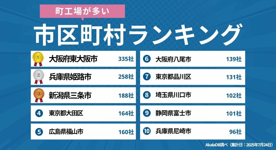デザインワン・ジャパン(東京)は4日、同社が運営する企業データベース「Akala DB(https://akala.ai/)」が保有するデータから、「町工場」が多い市区町村を全国30位までのランキング形式で発表した。