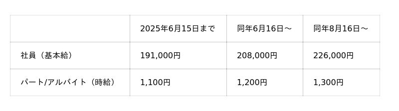当社では2025年6月16日付けで時給100円のベースアップを実施し、更に8月16日付けで再度、時給100円のベースアップを予定しております。