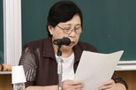 母ミヨシさんらの写真が並んだ展示を見つめる曽我ひとみさん=6日、佐渡市千種