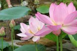 柏崎市内にある二つの池で、ハスの花がそれぞれ見頃を迎えている。午前7時〜9時ごろに花が開くと、訪れた人が写真に収めたり、散策しながら観賞したりして大輪の花を楽しんでいる。