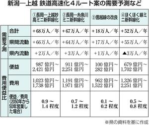 新潟県は、新潟市と上越地域を結ぶ鉄道の高速化で四つのルート案の需要予測などを明らかにした。4案をそれぞれ整備した場合、乗客需要は年間18万〜68万人増えると予想。一方、整備費用に対し金銭に換算できる便益がどの程度得られるかを示す「費用便益比」は、2案がメリットよりもコストが上回る結果となった。