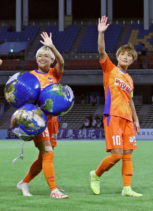 川澄奈穂美(左)と上尾野辺めぐみ=2023年10月