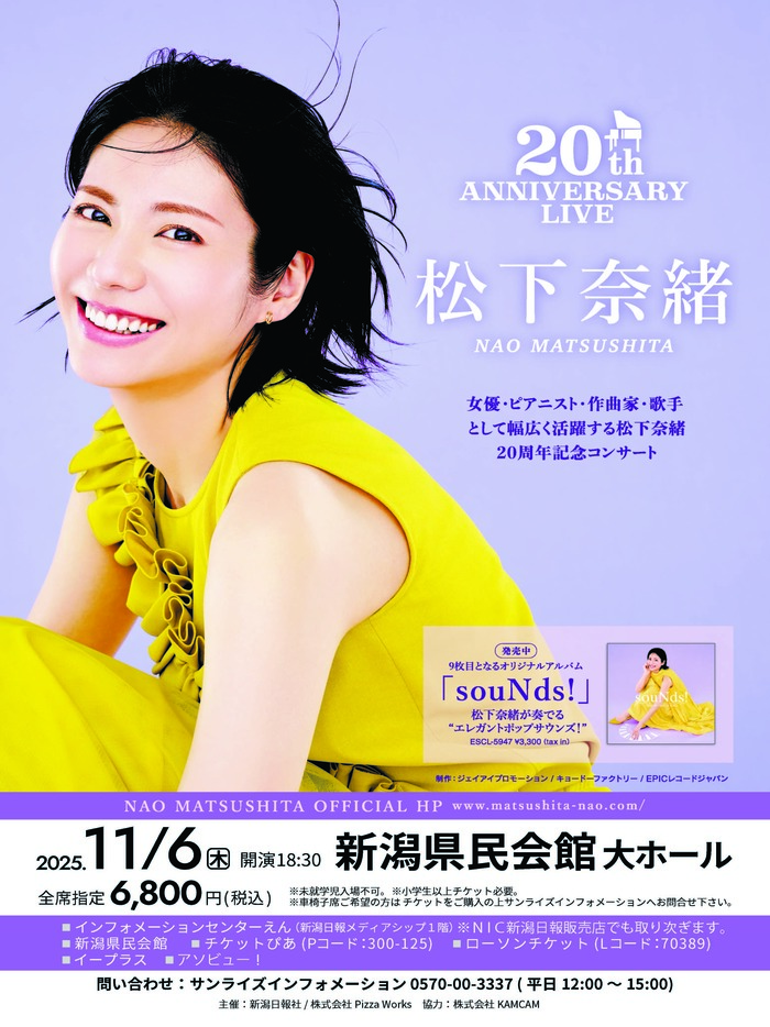 俳優、ピアニスト、歌手など幅広く活躍する松下奈緒さんのデビュー20周年記念コンサートが11月6日、新潟市中央区の新潟県民会館で開かれる。昨年発売したアルバムや自身がこれまで出演したドラマの主題歌などを披露する予定だ。松下さんは「上質な音楽と楽しいトークをお届けしたい」と意気込みを語った。