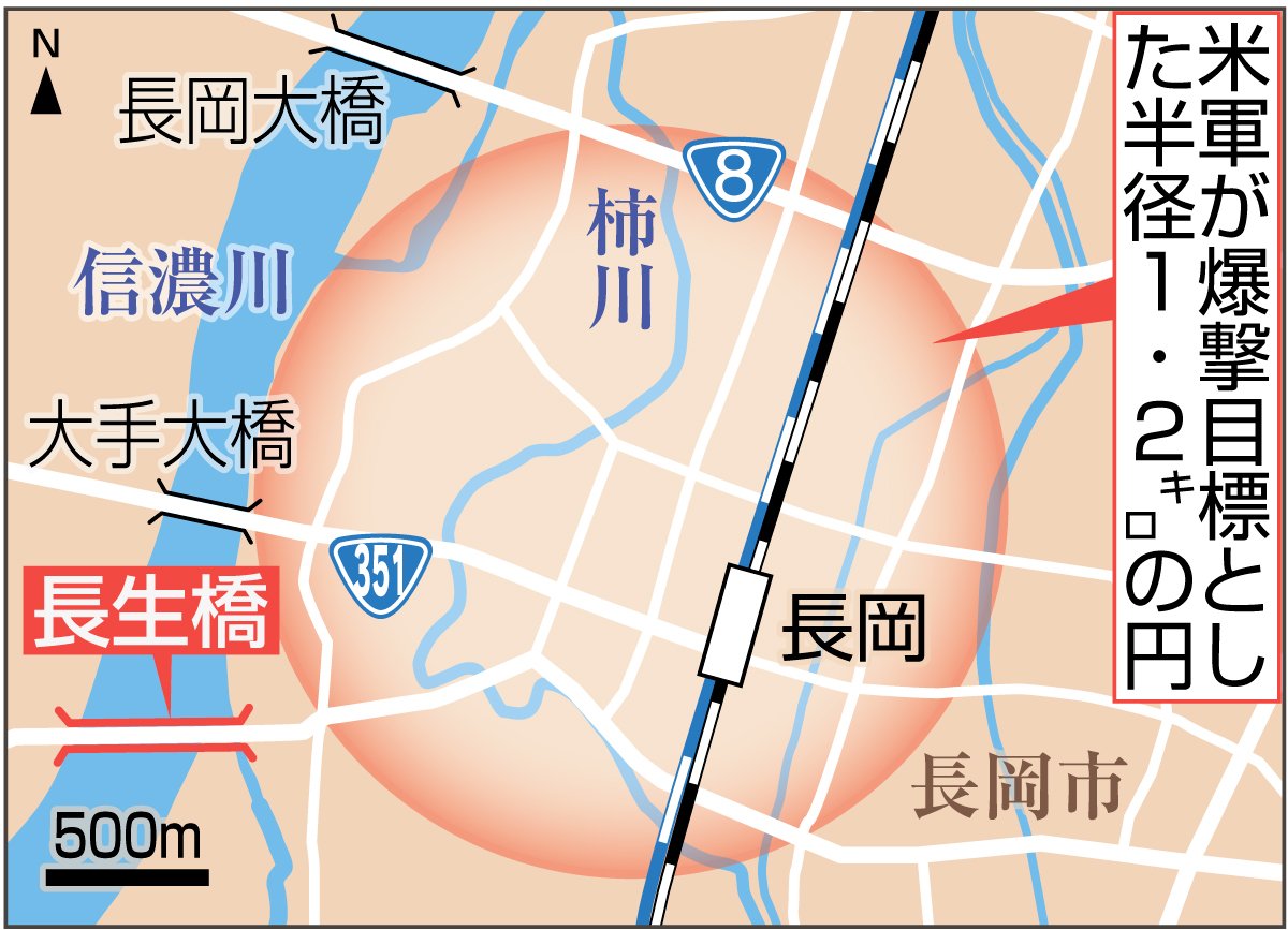 長岡空襲で火の海となった市街地から、人々が逃れようと目指したのが、信濃川に架かる長生橋だった。その長生橋は、米軍爆撃機B29が爆撃目標とした住宅密集地の上空に入る目印になっていた。