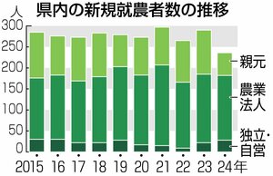 調査は新たに農業に従事した15〜44歳(16年以前は15〜42歳)が対象。近年は260〜290人台で推移しており、24年の236人は過去10年では最も少なかった。...