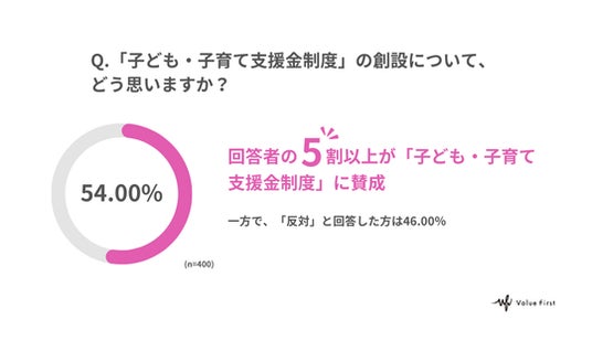 「子ども・子育て支援金制度の創設について、どう思いますか?」という質問に対し、「賛成」が54.0%で、「反対」が46.0%でした。