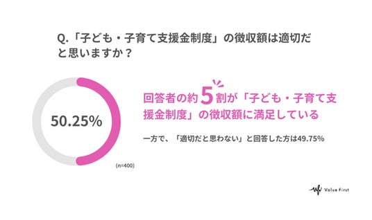 「子ども・子育て支援金制度の徴収額は適切だと思いますか? 」という質問に対し、「適切だと思う」と回答した方は50.25%でした。