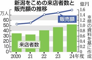 新潟県は15日までに、大阪市北区にある関西地方での情報発信拠点「新潟をこめ」の24年度の営業実績をまとめた。来店者数は52万1817人(前年度比11・2%増)、販売額は1億5896万円(同7・0%増)で19年12月のリニューアル以降、ともに過去最高を更新した。