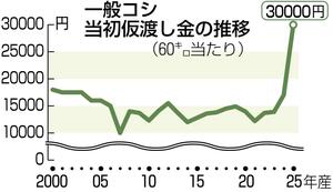 JA全農新潟県本部(新潟市西区)は19日、県内の地域農協(JA)に2025年産米の「仮渡し金コメの生産者が出荷時に受け取る前金。1年の販売期間に変動する売値や経費をもとに、最終精算される。JA全農県本部が地域JAに支払う仮渡し金と、地域JAが全農県本部の仮渡し金に上乗せするなどして生産者に支払う仮渡し金がある。生産者から直接コメを集荷する地域JAは全農県本部に出荷するほか、独自でも販売する。他県では概算金と呼ぶことが多い。 」の額を示した。一般コシヒカリ(1等米・60キロ税込み)は3万円と24年産当初比1万3千円増(76%増)で過去最高だった。引き上げ率も他銘柄を含め過去最大。民間業者との集荷競争を反映し、24年産に続き大幅な上積みとなった。