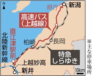 県は、新潟市と上越地域をつなぐ特急しらゆき(新潟-上越妙高・新井)と高速バスの利用促進に向け、ツアー商品の企画支援やチケット割引などを順次始めている。しらゆきと高速バスの利用実績に応じ、企業に奨励金10万円を支給。公共交通を使うことで新潟、上越両地域の一体感を高め、長期的にはしらゆきの増便にもつなげたい考えだ。
