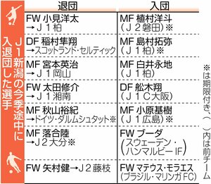 J1アルビレックス新潟は20日、FW矢村健(28)がJ2藤枝に完全移籍すると発表した。選手の移籍が可能な夏の登録期間は20日で終了し、新潟はシーズン途中に7選手を獲得し、7選手が他クラブへ移籍。MFダニーロ・ゴメスが手術のためチームを離脱するという例年にない規模の動きがあった。