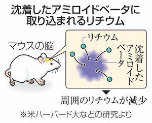 認知症で最も多い「アルツハイマー病脳内に「アミロイドベータ」や「タウ」といったタンパク質がたまり神経細胞が壊れ、認知機能が低下していく進行性の病気。次第に記憶力や判断力が低下し、着替えや食事など日常生活にも支障を来すようになる。(※ページ下部に詳細)」のような状態になりやすいマウスに、金属の一種「リチウム」を飲ませると認知機能の低下が抑えられることが分かったと、米ハーバード大などのチームが17日までに英科学誌ネイチャー...
