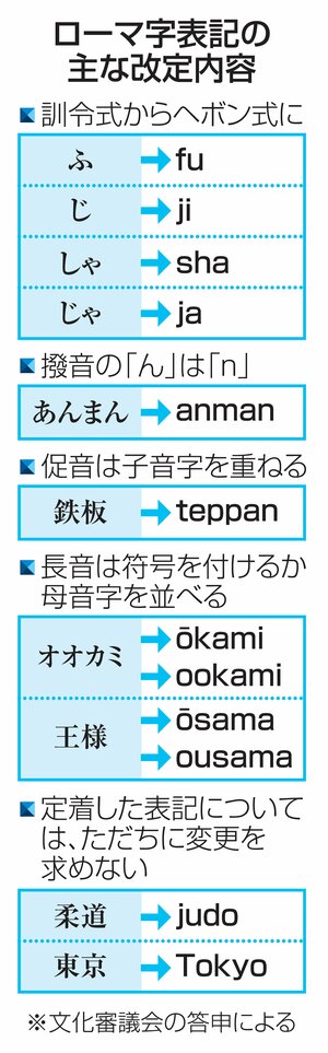 文化審議会は20日、ローマ字の表記方法について、現在広く使われている「ヘボン式」に基づくつづり方を採用するとの内容を阿部俊子文部科学相に答申した。政府は本年度中に現行表記法を定めた1954年の内閣告示を改定する。ローマ字表記の...
