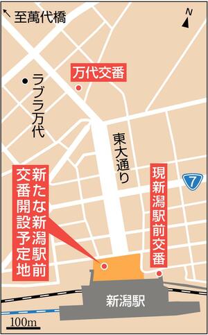 県警がJR新潟駅前の繁華街や商業エリアに位置する新潟署の新潟駅前交番(花園1)を移転し、万代交番(万代4)と統合して来年4月に新たな新潟駅前交番を駅万代広場内に開設することが分かった=地図参照=。県警が21日の定例会見で明らかにした。県内最大規模となる約20人を配置する予定で、周辺での対応力強化を狙う。