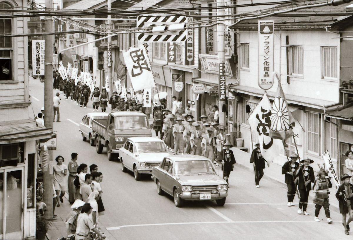 上越市公文書センターによると、現在のメインイベント「出陣行列」が始まったのは61年。激戦だったとされる第4次川中島合戦から400年の節目に、祭りのハイライトとして「謙信公出陣仮装行列」が行われた。翌62年は約120人の行列が「南本町を出発、本町通りをねり歩いた」と新潟日報は報じている=冒頭の映像参照・随時掲載企画[昭和100年の日報ニュース]=。