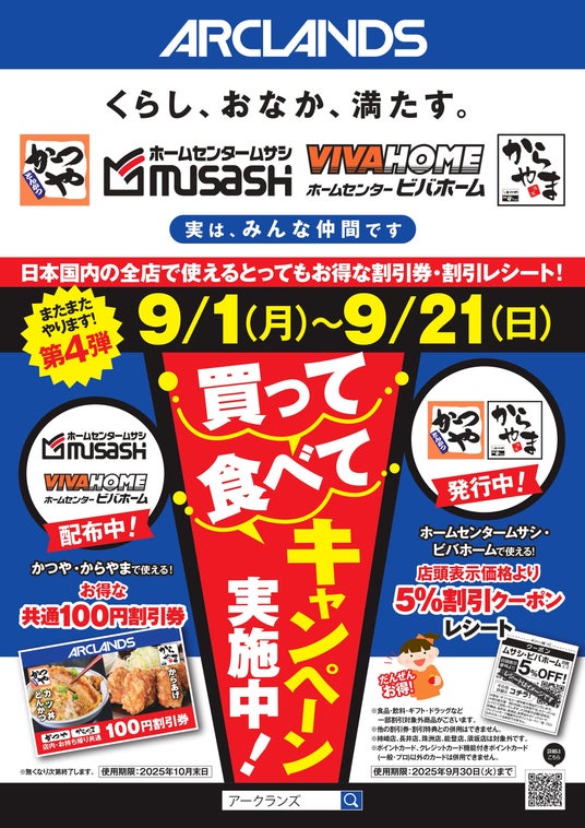 生活価値提供グループを目指し「ホームセンタームサシ」、「ビバホーム」などを運営するアークランズ株式会社と、食を通して新しい価値をお客さまへ提供するとんかつ専門店「かつや」、からあげ定食専門店「からやま」など飲食店を運営するアークランドサービスホールディングス株式会社は、第4弾となる『買って 食べて キャンペーン』を2025年9月1日(月)~21日(日)に開催いたします。