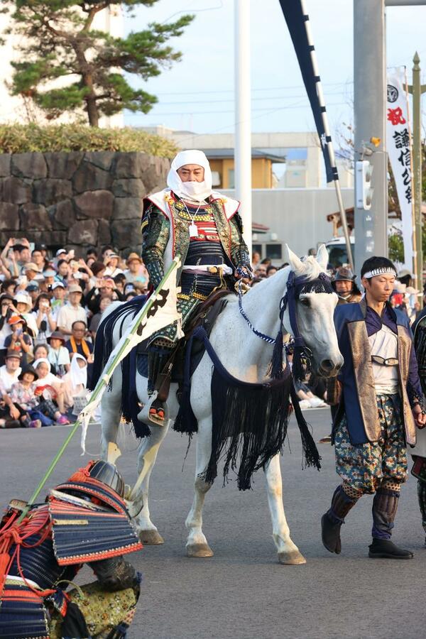地元の戦国武将、上杉謙信をたたえる「謙信公祭」の出陣行列が23日、上越市春日山地区で行われた。100回目を迎えた今年は、俳優で歌手の松平健さん(71)が謙信役を務め、白頭巾と甲冑(かっちゅう)をまとった勇ましい姿を披露。沿道に詰めかけた観衆から大きな歓声が上がった。