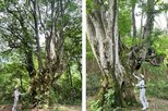 幹回りが7メートルほどのトチの巨木を紹介する梁川廣司さん=胎内市下荒沢