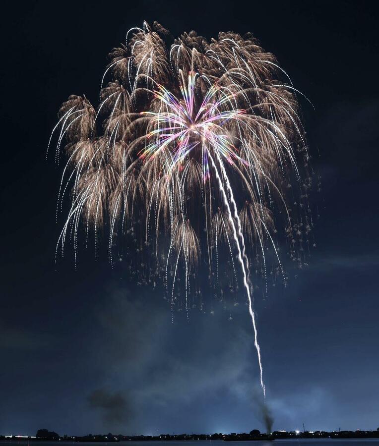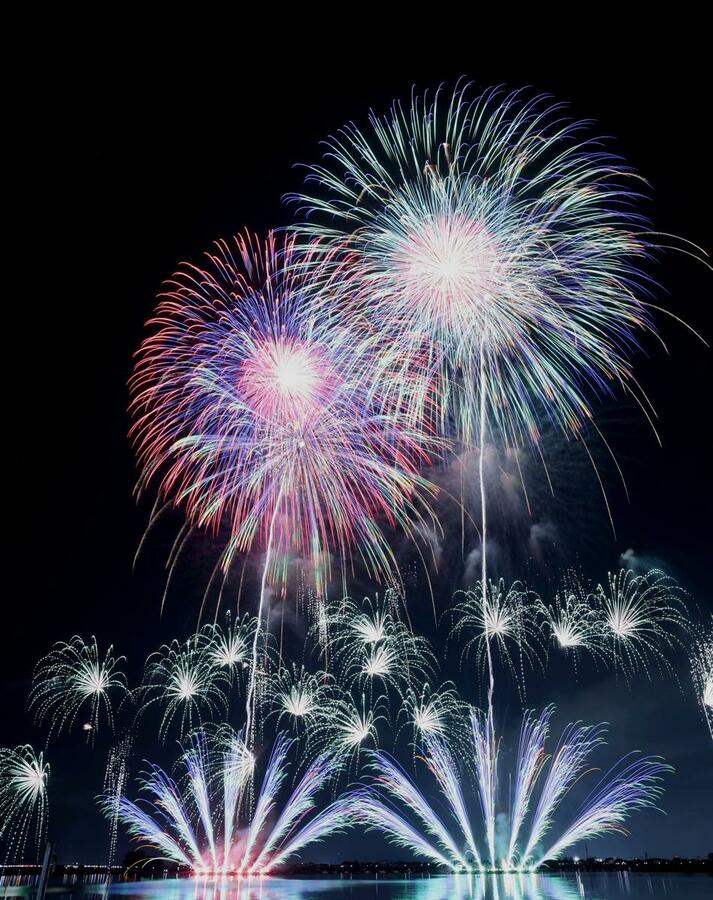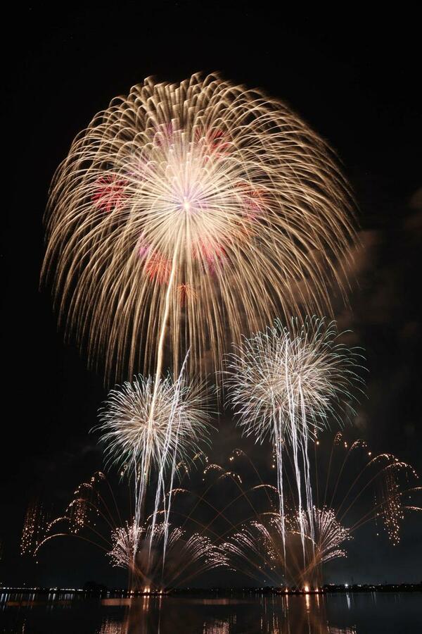 北区と東区の住民らでつくる協賛会が主催し、今年で51回目。地元小学生が仲間との協力を表現した「野球ボール」などのデザイン花火や、新潟水俣病が繰り返されないようにとの願いが込められた2尺玉が打ち上げられた。フィナーレの超特大スターマイン「花鳥風月」が夜空を染めると、拍手や歓声が上がった。