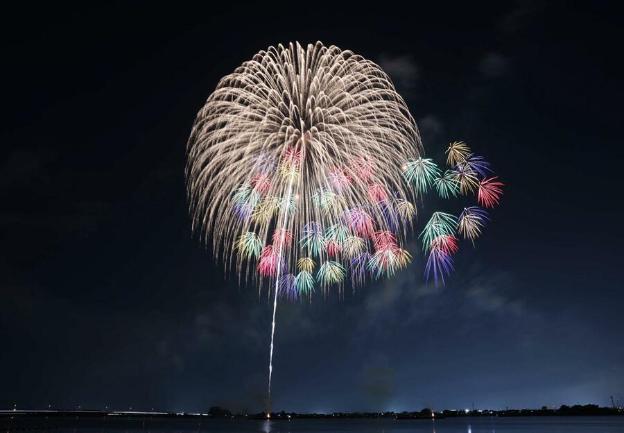 晩夏の風物詩「阿賀野川ござれや花火」が25日、新潟市北区と東区の阿賀野川河口で開かれた。家族連れらが河川敷を埋め、夜空を彩る約4000発に酔いしれた。