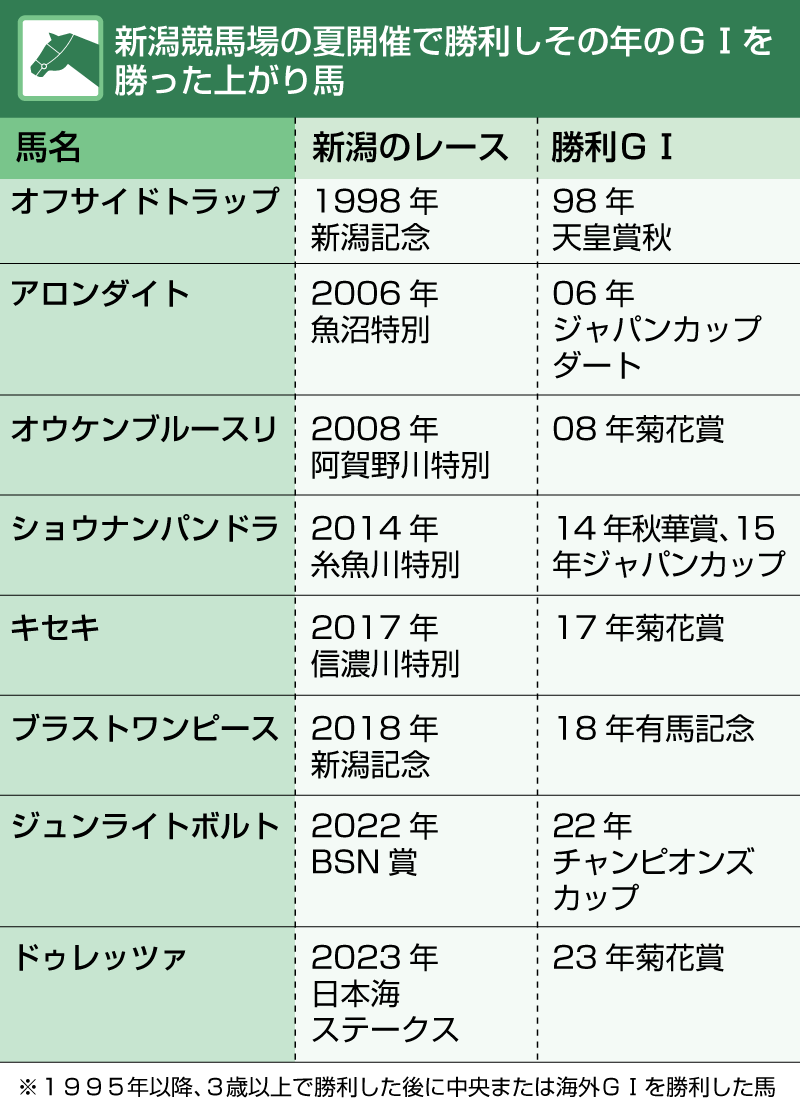 新潟記念(芝2000m)からGⅢを制した馬といえば、1998年のオフサイドトラップだ。8歳にして7月のGⅢ七夕賞(福島競馬場)で重賞初制覇を果たすと、その勢いのまま新潟記念を1番人気で制した。