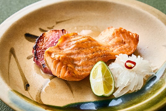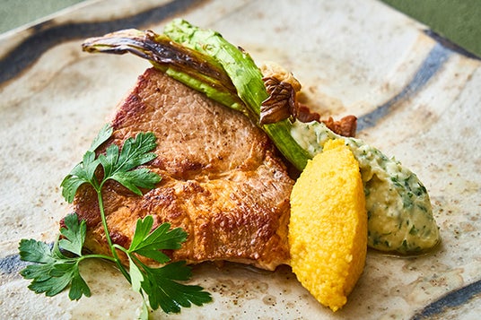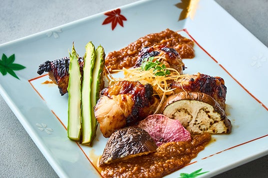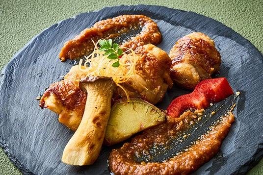 柔らかくジューシーで、脂肪分が少なくヘルシーな新潟県産のブランド鶏“越の鶏”を、新潟県産のかんずりを加えたピリ辛味噌で焼き上げました。季節の野菜とともにお楽しみください。