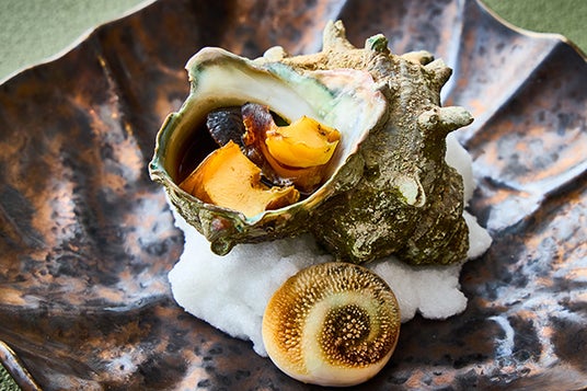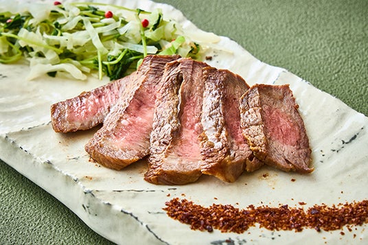 大ぶりで甘みが強く肉厚な丸茄子に、きめ細かい霜降り、なめらかなくちどけに豊かな風味が特徴の長野県産和牛を挟みました。焼くことで丸茄子はトロッとなり、和牛はより柔らかな食感を感じていただけます。長野県の名産品“八幡屋礒五郎の七味唐辛子”を3種類添えましたので、味比べをしながらご賞味ください。