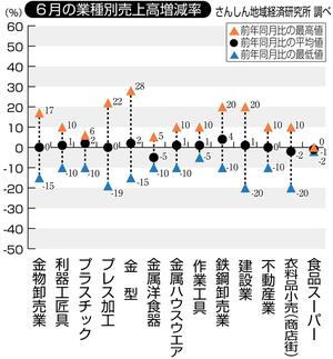 三条・燕地区の地場産業は、6月の売上高増減DI(「増加」した企業割合から「減少」した企業割合を差し引いた値)が、4カ月連続でプラス圏内となった。原材料高騰の価格転嫁に一定の効果がみられる。高齢化や人手不足による事業縮小や廃業が増加傾向で、M&Aを検討する動きがある。米関税措置の直接的な影響は限定的だが、業況判断DIは足元、先行きともマイナスが続く。