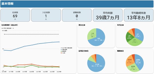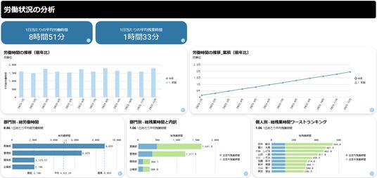 「労働時間」「年次有給取得状況」など17種のカードで構成。労務コンプライアンス、ワークライフバランス指標、人材の流動性、多様性など、社員の働き方と組織構造を網羅的に“見える化”できます。その結果、人事・総務部門における法令遵守リスクの早期発見や採用・定着施策、従業員の健康管理、ワークライフバランス改善に向けた戦略立案のPDCAをスピーディに回せます。
