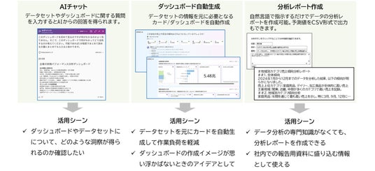 AIチャットやダッシュボードの自動生成などにより、専門知識がなくても必要な情報を簡単に引き出せます。これにより、担当者のスキルに関わらず、全社でデータ活用が進めやすくなります。また、ボタン一つでデータから読み取れる情報をテキスト化する機能も備わっているため、効率的に報告用資料の作成が可能となります。
