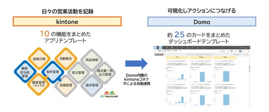 お客様任意の5つまでのkintoneアプリのデータをDomoに接続し、それぞれのアプリデータが一つに集約されたダッシュボードを構築。現場担当者はレポート作成ではなく課題の発見と改善に集中できます。kintoneのライセンスを持たない経営層や他部門のメンバーともDomoを通して同じダッシュボードを共有でき、情報解釈のブレを防止しながら全社的な意思決定スピードを飛躍的に向上させます。