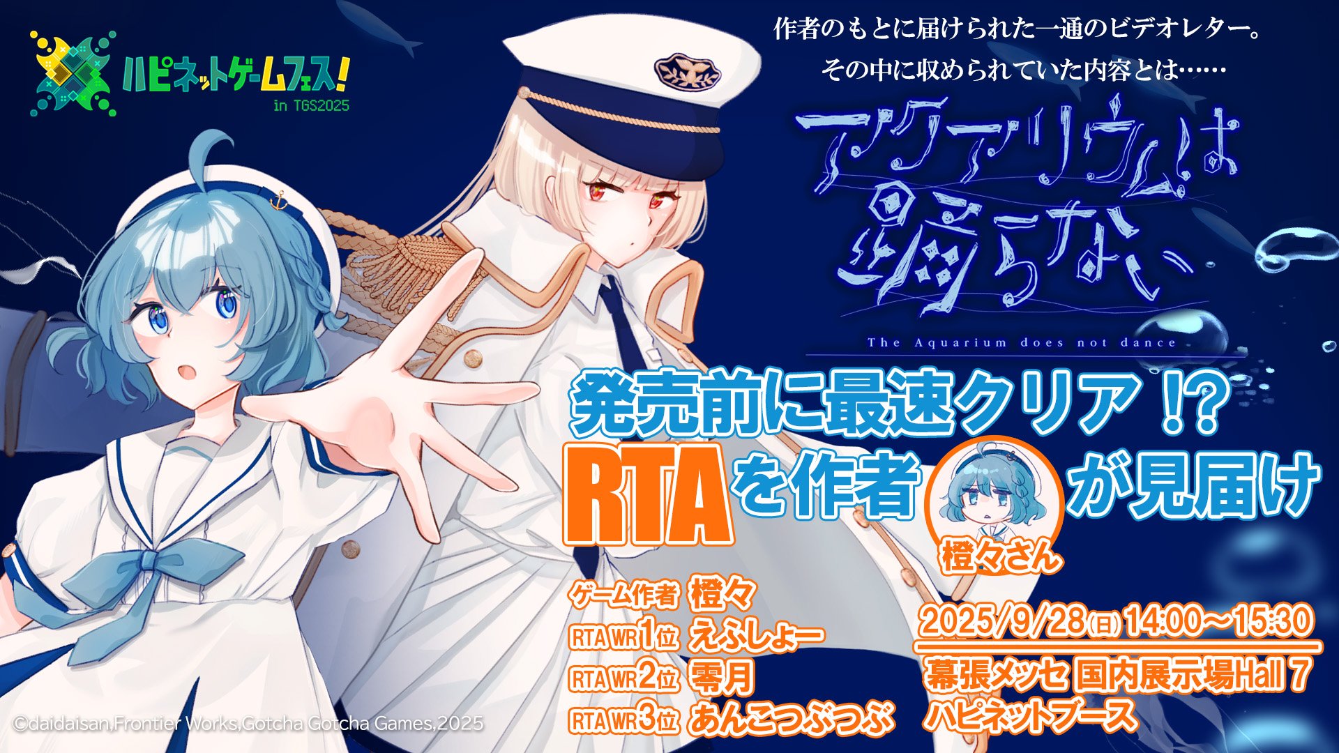 新潟県人の橙々(だいだい)さんがたった1人で8年間を費やして開発したホラーゲーム「アクアリウムは踊らない」が、日本最大級のゲームの祭典「東京ゲームショウ2025」(TGS、9月25~28日・幕張メッセ)でステージイベントを行うことが28日、発表された。橙々さんが登壇し、ゲームの最速クリアを見届けるというユニークな内容となっている。