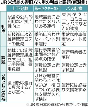 2022年8月の県北豪雨で被災し、坂町(村上市)-今泉(山形県)で運休が続くJR米坂線の復旧について議論する「米坂線復旧検討会議」の第6回会合が27日、関川村で開かれた。JR東日本は、復旧後の運営パターン案それぞれの利点や課題、JRの関わり方を提示。運営主体がJRでなくなる第三セクターへの移管やバス転換した場合でも、運行などを支援していく考えを示した。沿線自治体は、支援内容をより具体的にするよう求めた。