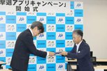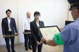 贈呈式が行われ当選者に電話機が贈られた=阿賀町役場