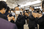 早々と花角さんの当選確実の報が伝えられると、会場にはどよめきが広がった。支援者からは「どうしてこんなに早く決まるの」といった声も上がった。