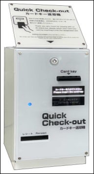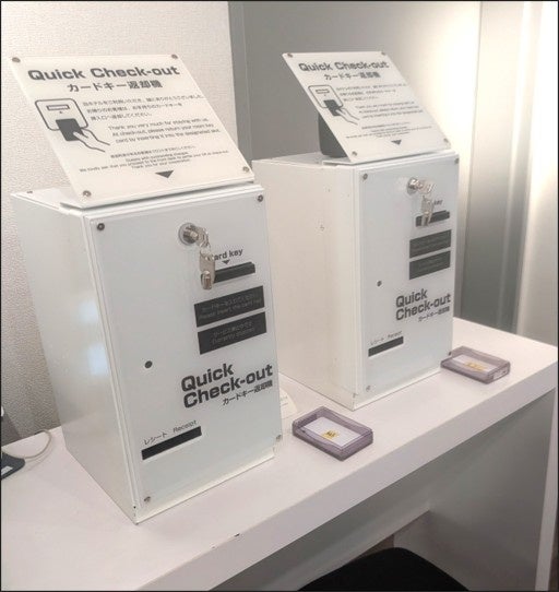 ・自動チェックアウト機自動チェックアウト機は「チェックアウトの混雑を解消したい」、「自動チェックイン機を購入したいものの費用や館内に設置スペースもなく難しい」といったお悩みやリクエストが宿泊施設様より多数寄せられたことで開発に着手。チェックアウト時のフロントの混雑解消を図る弊社の新サービスになります。約50cmの高さに収まるスリムな設計※2でスペースを取らず、電源とWi-Fiのみで利用可能。宿泊施設様へ負担をかけず導入が可能です。