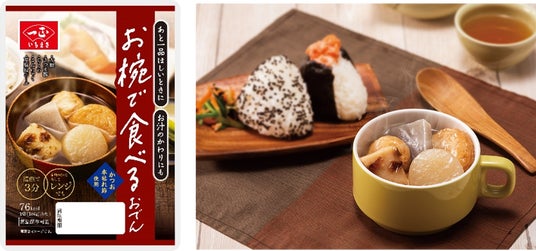 “がんばる料理”や“作り過ぎてしまう料理”というイメージのあったおでんを、お椀にちょうどよくおさまるサイズにすることで、食卓のすき間にすっとなじむ、簡単おかずに。耐熱容器に移して、電子レンジで温めるだけで、プラス一品のできあがりです。だしの旨みで"汁物以上"の満足感を感じられます。常温でコンパクトに保存ができるため、ご家庭に1つはストックしておきたい商品です。