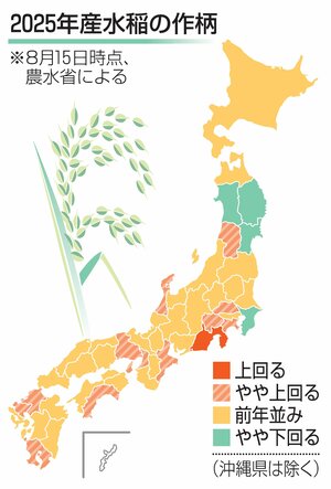 農林水産省は29日、2025年産主食用米の全国の作柄概況(8月15日時点)を発表した。単位面積当たりの収量は前年比で「上回る」と「やや上回る」が13府県、「前年並み」が本県を含む29都道府県と予測。生産状況はおおむね良好だと分析した。岩手と宮城、秋田の東北3県と千葉県は「やや下回る」だった。「下回る」はなかった。