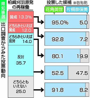 新潟日報社が29日に実施した新潟県知事選の出口調査では、東京電力柏崎刈羽原発の再稼働に「反対」は35・7%、「どちらかといえば反対」は14・0%で、計49・7%が否定的な回答をした。このうちのそれぞれ52・5%、80・1%が花角英世さんに投票した。再稼働の賛否を問う県民投票に関しては「必要」「どちらかといえば必要」が計66・1%を占めた=グラフ参照=。