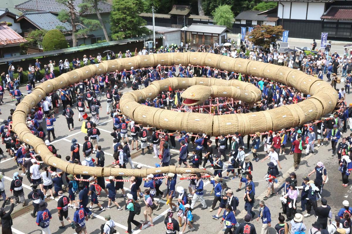 まつりは1967年の羽越水害の記憶を後世に伝えようと88年に始まった。水害が発生した8月28日に合わせ、ヘビの全長は82・8メートル。「竹とわらで作られた世界一長いヘビ」としてギネス世界記録にも認定されている。今年の大蛇は8年ぶりに作り直され、10代目になる。