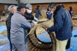 竹とわらの大蛇が村内を練り歩いた「大したもん蛇まつり」=31日、関川村役場