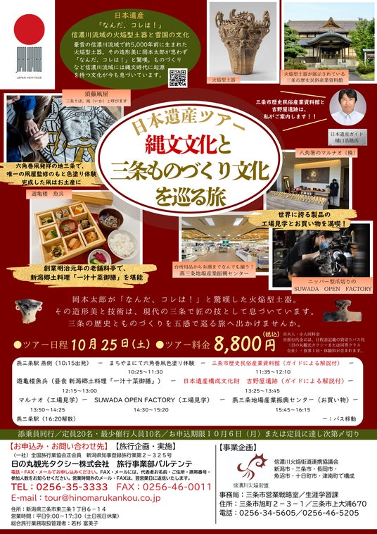 信濃川火焔街道連携協議会(会長:三条市長 滝沢 亮)は、10月25日(土)に、三条市において、日本遺産に認定された『「なんだ、コレは!」信濃川流域の火焔型土器と雪国の文化』のストーリーが体感できるツアーを開催します。日本遺産ガイドの案内で日本遺産構成文化財である吉野屋遺跡とその出土品も展示される三条市歴史民俗産業資料館を見学するほか、三条市発祥の六角巻凧の色塗り体験やオープンファクトリーの見学で、三条市の歴史とものづくり文化を体感いただきます。