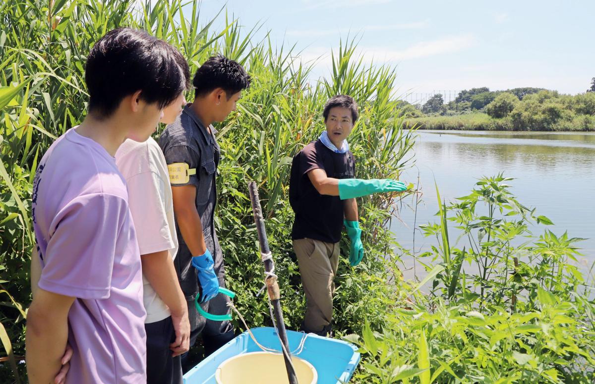 この日は、環境問題や生物に関心を寄せる高校生2人も同行。飯田さんらは雌雄や種類の見分け方、カメの生態などを説明しながら、約3時間かけて17個のわなを引き揚げた。