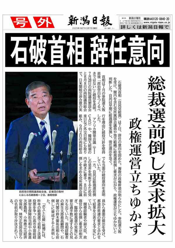 【号外】石破茂首相が辞任の意向 2025/9/7 16:35 (最終更新: 2025/9/7 19:00) PDFで号外を見る トップページで最新情報を見る 関連ニュース 【号外】新潟県知事が柏崎刈羽原発再稼働を容認 11/21 【号外】日経平均初の5万円台 10/27 【号外】新首相に高市早苗氏、女性で初めて選出 10/21 【号外】燕市の新市長に前市議の佐野大輔氏 10/20 【号外】北信越高校野球・帝京長岡が優勝 10/19 【号外】公明党が連立政権離脱へ 10/10 【号外】ガザ全人質解放へ 10/9 【号外】ノーベル化学賞に北川進京都大特別教授 10/8 ノーベル化学賞に京都大特別教授の北川進氏ら 10/8 【号外】ノーベル生理学・医学賞に大阪大栄誉教授の坂口志文氏ら3氏 10/6 【号外】自民党新総裁に高市早苗氏 10/4 【熱中症に注意】新潟県内に熱中症警戒アラート発表中(8月26日) 8/26