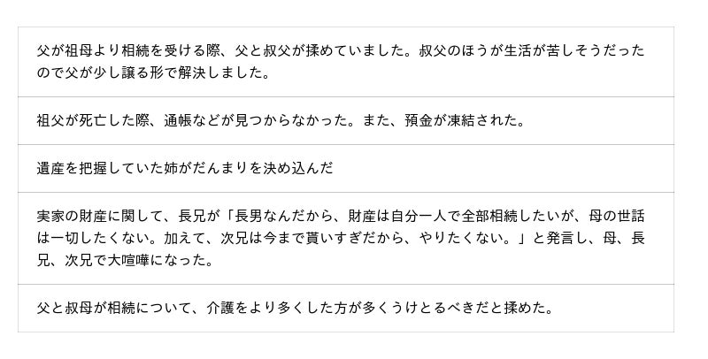 これらの回答から、遺産相続のトラブルを避けるためには、生前から家族で話し合い、遺言書を作成するなど、事前の準備とコミュニケーションが必要になると考えられます。