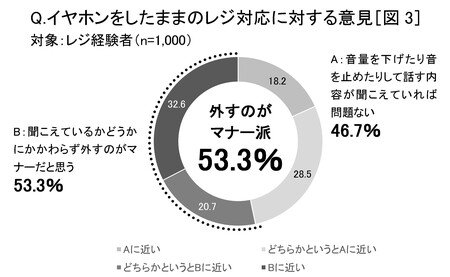 レジ業務経験者に、お客さまがイヤホンをしたままレジ対応を受けることについて、どちらの考えに賛同するかと聞くと、A:「聞こえていれば問題ない」と考える人は46.7%であるのに対し、B:「外すのがマナー」と考える人が53.3%で多数派となりました[図3]。レジでのやりとりにおいては、聞こえるかどうか以上に「マナー」として外すべき、という意識が強いことが分かります。