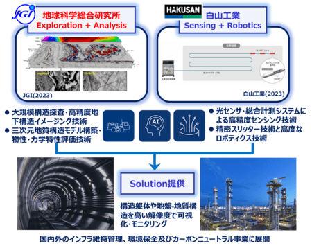 当社は、長年に亙り、物理探査技術を用いて、構造形態・物性・力学特性を含む三次元地下構造のイメージング事業に携わっております。また、白山工業株式会社は、高度なセンシング・ロボティクス技術の開発と実用化に継続的に取り組んでいます。今回の業務提携によって、両社が保持する先進的なイメージングとセンシング技術を融合した技術パッケージを社会実装し、国内外におけるインフラ維持管理、環境保全及びカーボンニュートラル等の多様な事業分野において、社会課題や地球環境課題の解決に真摯に取り組んで参ります。