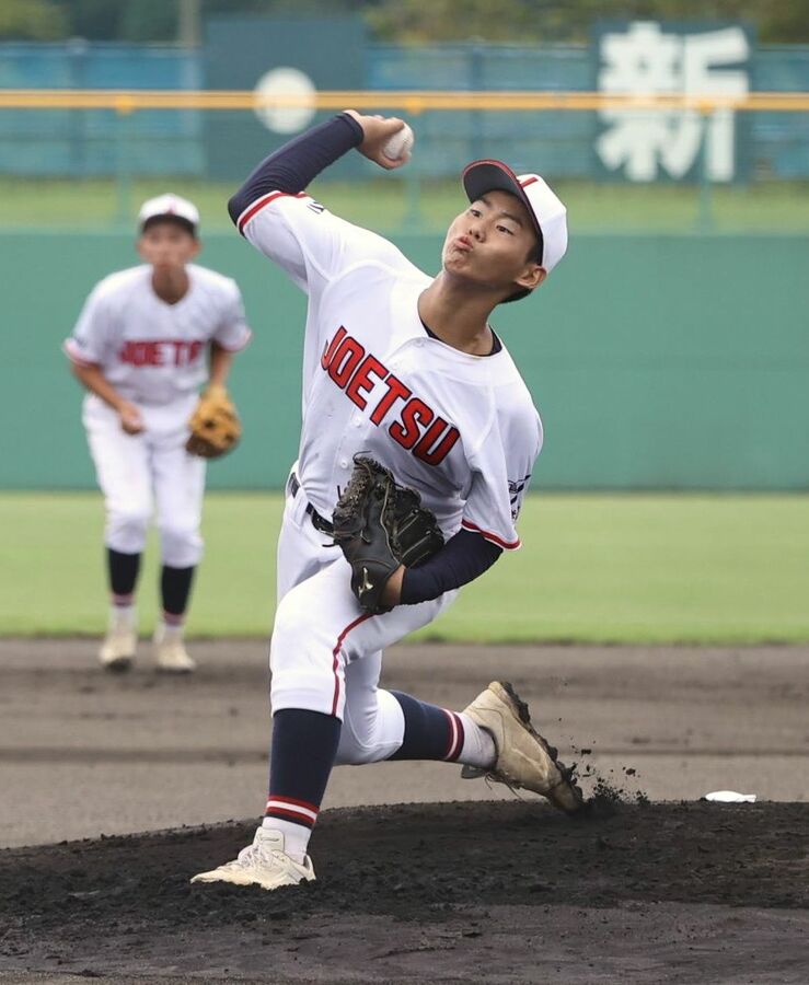 上越-六日町 先発した上越の1年生投手、竹内孝太=柏崎市佐藤池